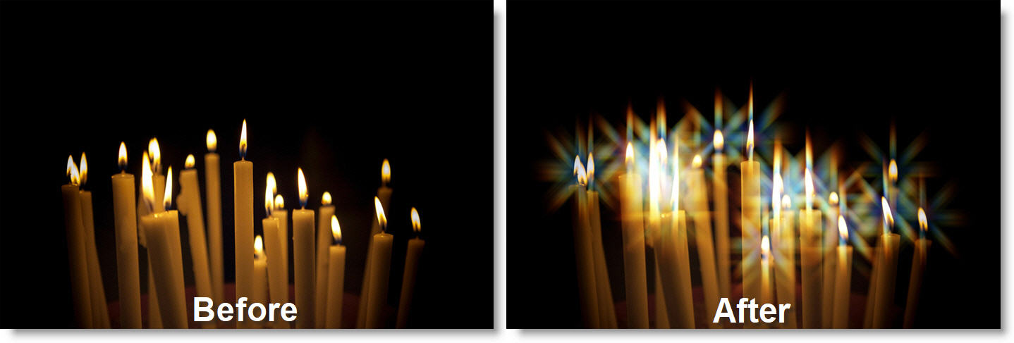 Generates star shaped rainbow colored glints at locations where the image is brighter than the threshold.