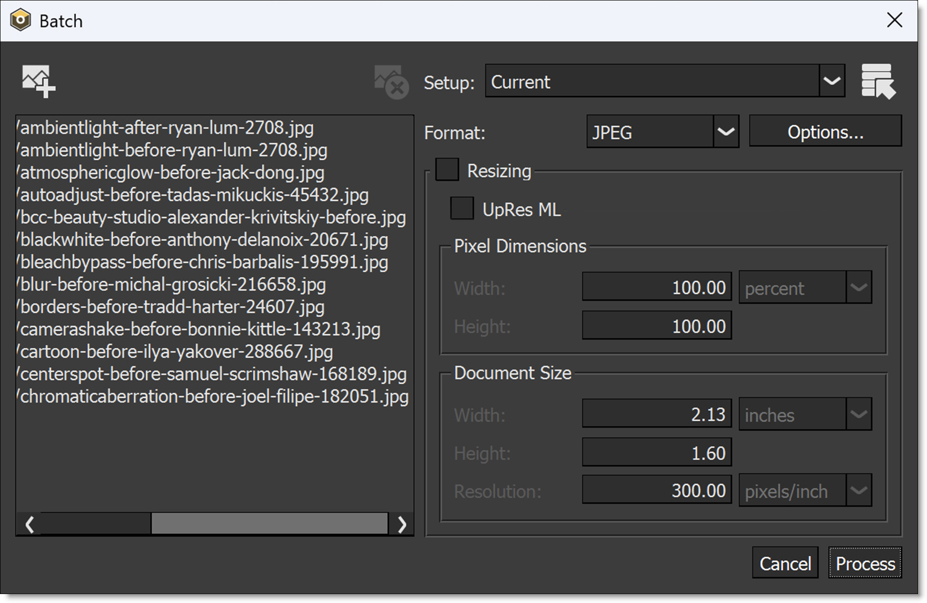 The next step in the Batch process is to select a Setup to be applied to all of your images. A Setup takes a snapshot of the filters and masks applied to your image in the Layers window. Setups can be saved and loaded and are independent of the image they were originally applied to. By default, the Setup parameter is set to Current, for the current setup.