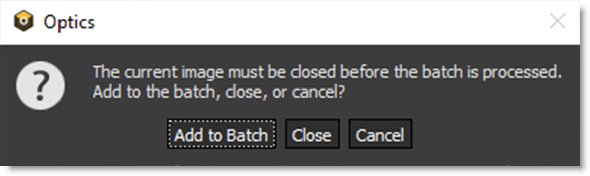 A window pops up stating, “The current image must be closed before the batch is processed. Add to batch, close or cancel?”