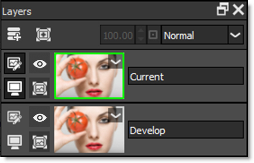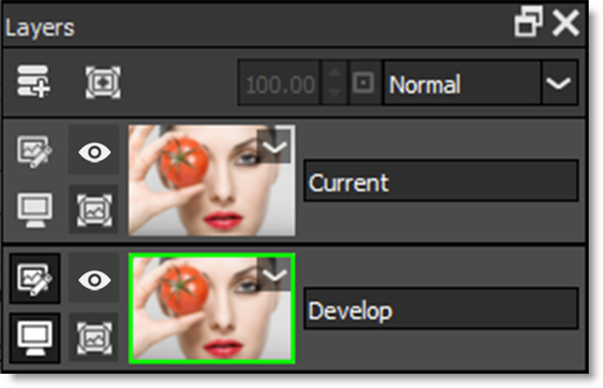 You are now viewing and editing the Develop layer. The layer that you are editing is considered the active layer. You can tell which layer is active by the green outline around its image thumbnail in the Layers window.
