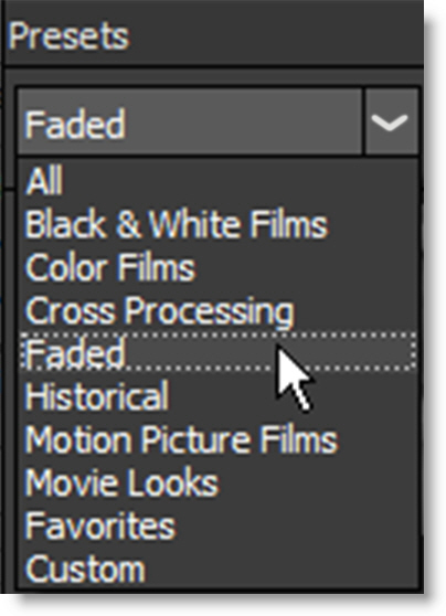 The Presets window allows you to select from a set of pre-defined presets. Presets are available for most filters so that you can easily click through the various choices.